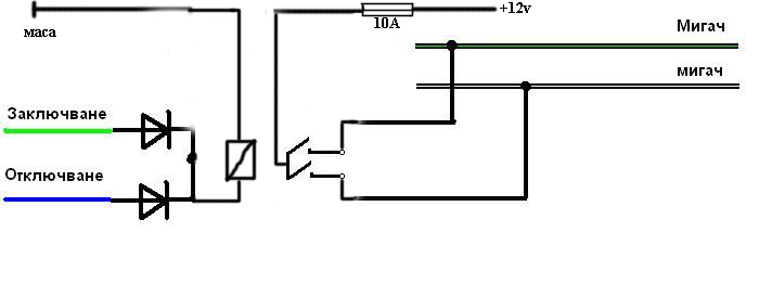 Схемата ми помогна и вече имам централно с мигащи мигачи при заключване/отключване.