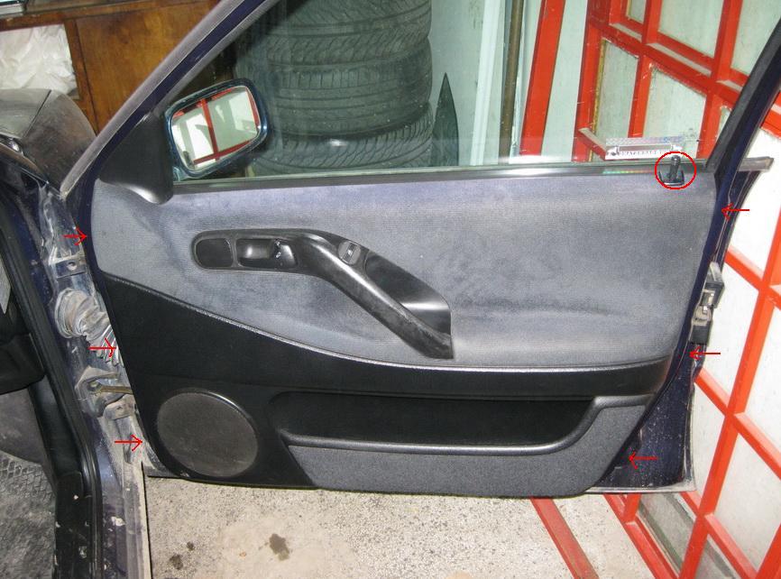 На тази снимка съм показал с червените стрелки къде се намират 2-те винтчета които също държат кората на вратата. След като се развият и те, издръпваме кората към нас и след това я повдигаме леко отдолу да се откачи от щипките.