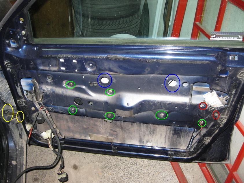 След като сме разкачили кабелите, се захващаме да сваляме машинката на централното, която е захваната с 2 винтчета които се отхлабват само и машинката се измъква с приплъзване, със синьо съм отбелязал отворите през които се развиват двата болта които държат прозореца към механизма. Болточетата които държат механизма на ел. прозореца са 6 броя отбелязани в зелено. Изваждането на механизма не е трудно. Трябва да се махне старничния водач който води механизма, намира се на лайстната къде е захванат прозореця отдясно той се маха с голяма отверта и малко сръчност. Със жълто съм отбелязал откъде се развиват винтчетата за сваляне на стопера на вратата от към купето е с ключ 13 отгоре и ключ 10 отдолу, а откъм врата са две винтчета и се вади откъм вратата. Буксата на ел.механизма се вади като се извади нагоре пластмасата и след това се издръпа напред.