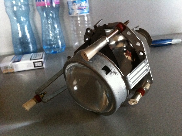 Забелязваме, че има метален "щит", който върши работата на пластинката в халогенната крушка. Когато се подаде сигнал за "дълги", самата ампула се премества и светлината минава и през процепа в "щит"-а и имаме "дълги".