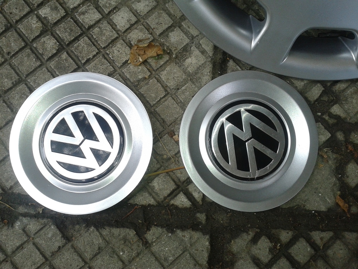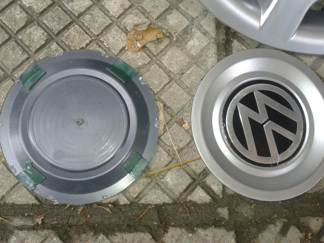 Кръга в средата на тасовете съвпада с оригиналния размер на капачката, изрязва се с клещи резачки или лист ножовка. За целта тасовете трябва да не са с плътен кръг а такъв с точки. За 10мин се изрязват и след това се залепят с двойнолепещо тиксо емблемите. Ето малко снимки (джантите и тасовете са 15 цолови):