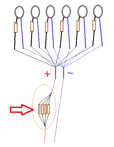 Както е на твоята схема в кръгчето слагаш резистор 1000 ома. После ако искаш по-силно го махаш и слагаш 500 ома и тн, ако искаш по слабо слагаш 2000 ома и тн. Така ще си само с един единствен резистор и няма да има паралелно и успоредно, което да те обърква. Ако много грее резистора си вземаш друг с по-голяма мощност със същото съпротивление.