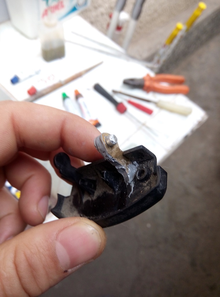 , понеже още със закупуването на колата беше счупено(счупеното краче липсваше) и само се подхвърляше в жабката. След бързи замери на едното краче се заех със набавянето на необходимите материали - нит с подходящия диаметър на цилиндъра, бронзова ламаринка и поксипол