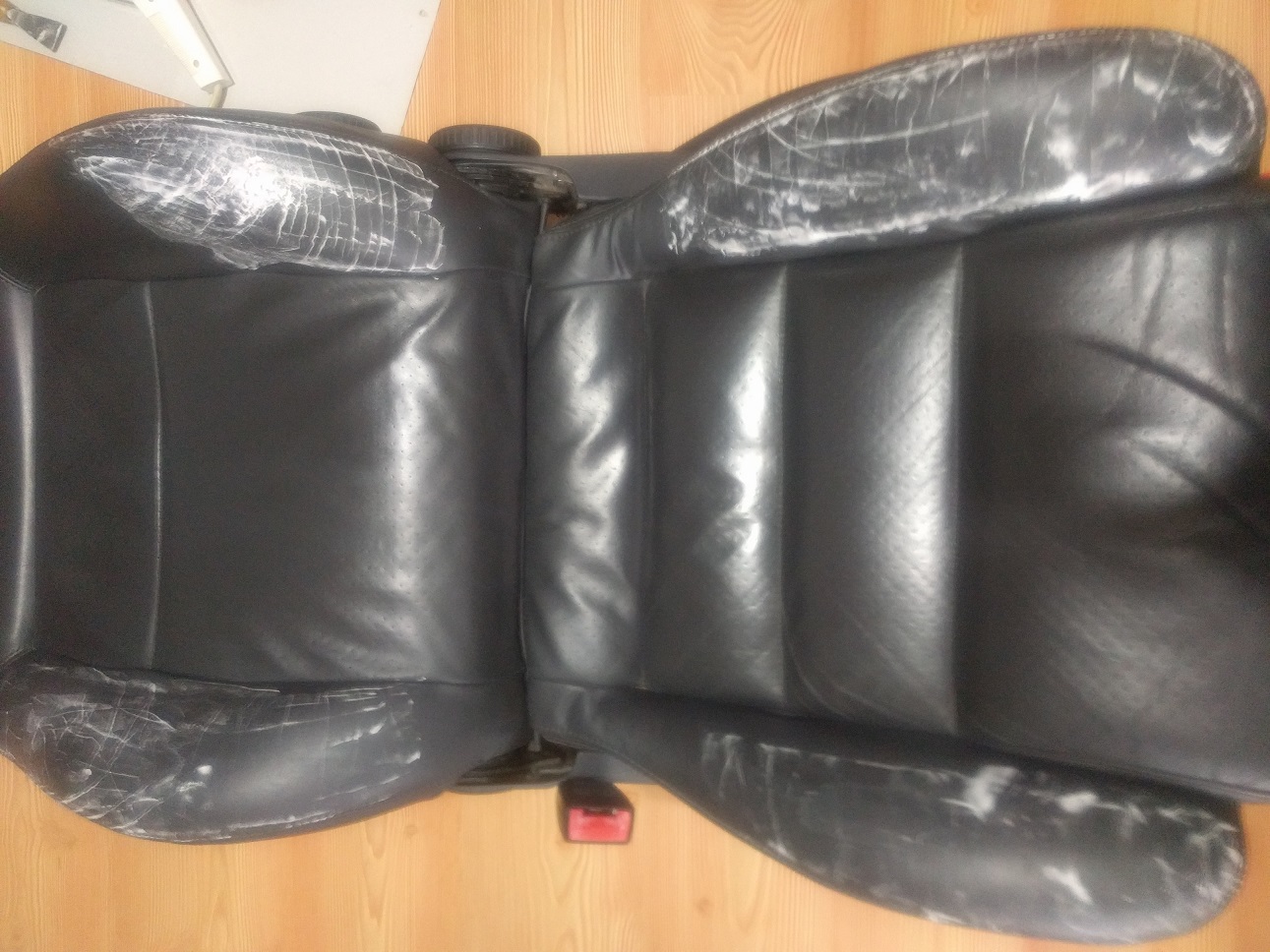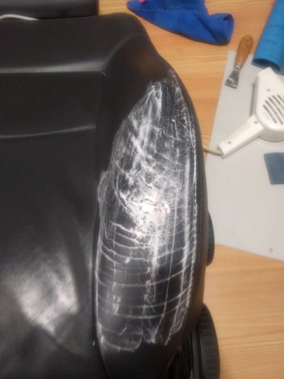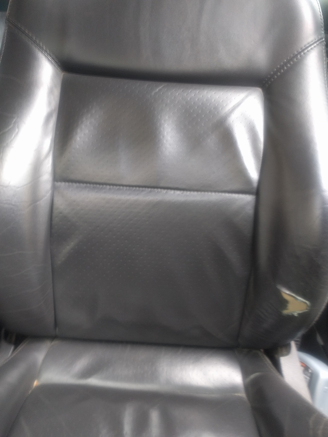 6. Подготовка за боя: С шкурката 400 суха обтриваме цялата седалка с леки плавни движения, целта е да матираме кожата, да махне всички мазнотии от кремове пот и т.к. След шкурката забърсваме с влажна кърпа и минаваме с едни рошави кечета от комплекта(абразивни кърпички) и от ново забърсваме с влажна кърпа. След като сме изчистили на всякъде и видимо няма лъскави петна обтриваме седалката с влажна кърпа. Изсъхва за 5мин и нанасяме с микрофибъра препарат номер 1 от комплекта. Духаме с пистолет за горещ въздух или сешоар или чакаме 5 мин. Нанасяме препарат номер 2 от комплекта по същият начин и отново духаме или чакаме 5 мин. Разтръскваме боята, от шише номер 3 и с тампон(дунапрен в комплекта) с тампониращи движения нанасяме боята. Не търкаме защото става на черти. Минаваме с пистолета за горещ въздух за по-добро съединяване или чакаме 20 мин.