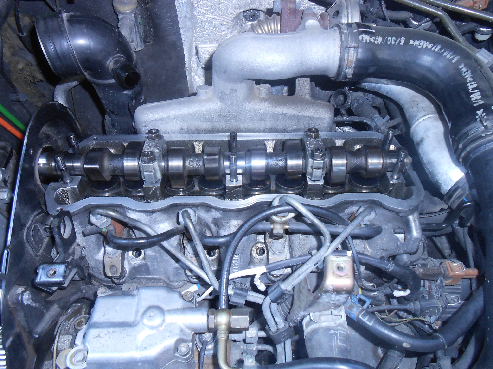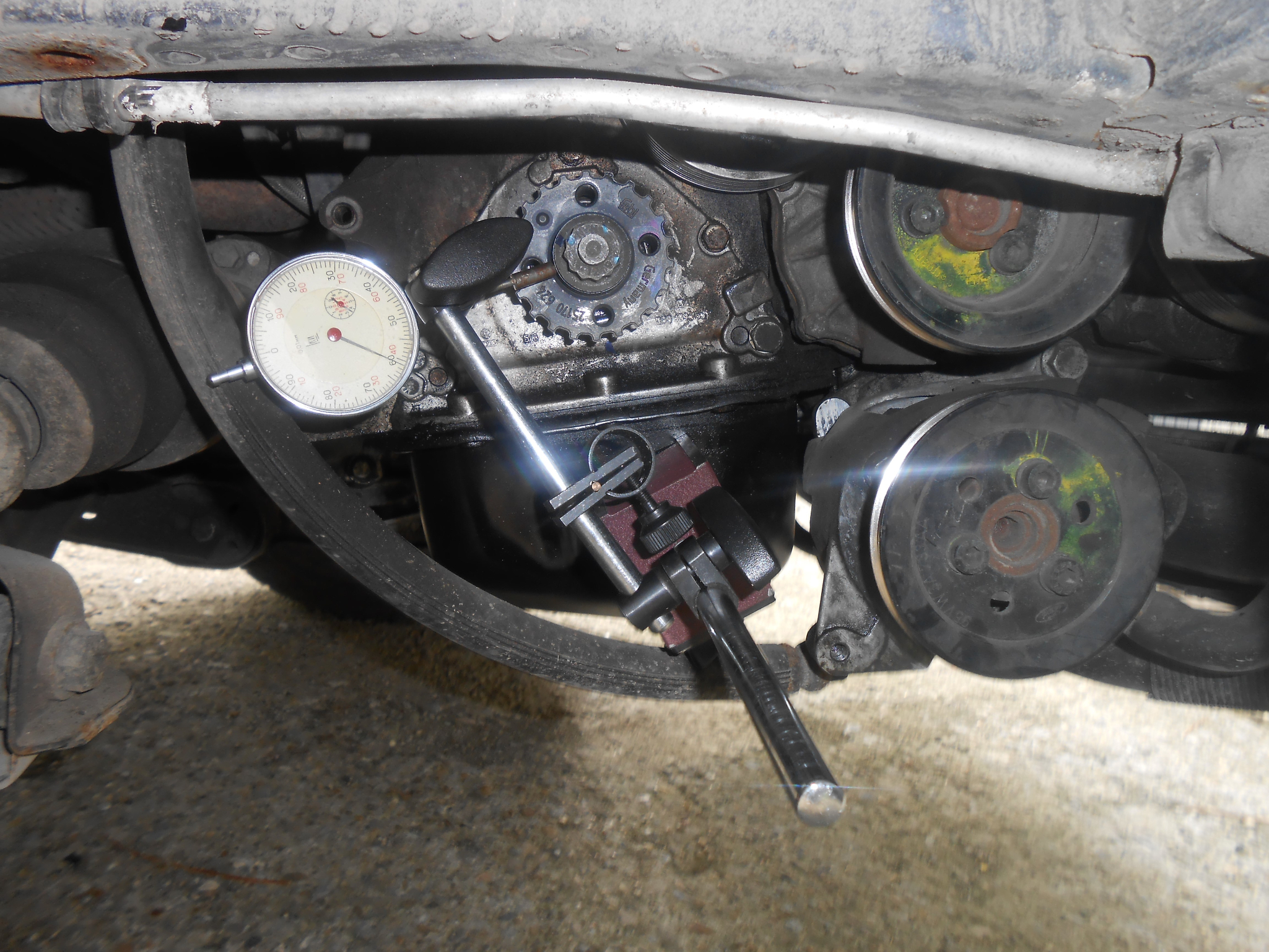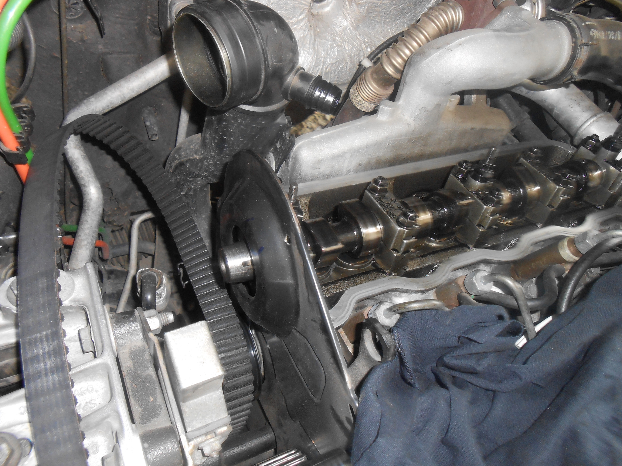 Превъртаме вала до ГМТ, застопоряваме колелото на помпата, освобождаваме ангренажния ремък и демонтираме разпределителния вал за да можем да въртим коляновия накъдето искаме без буталата да удрят клапаните.