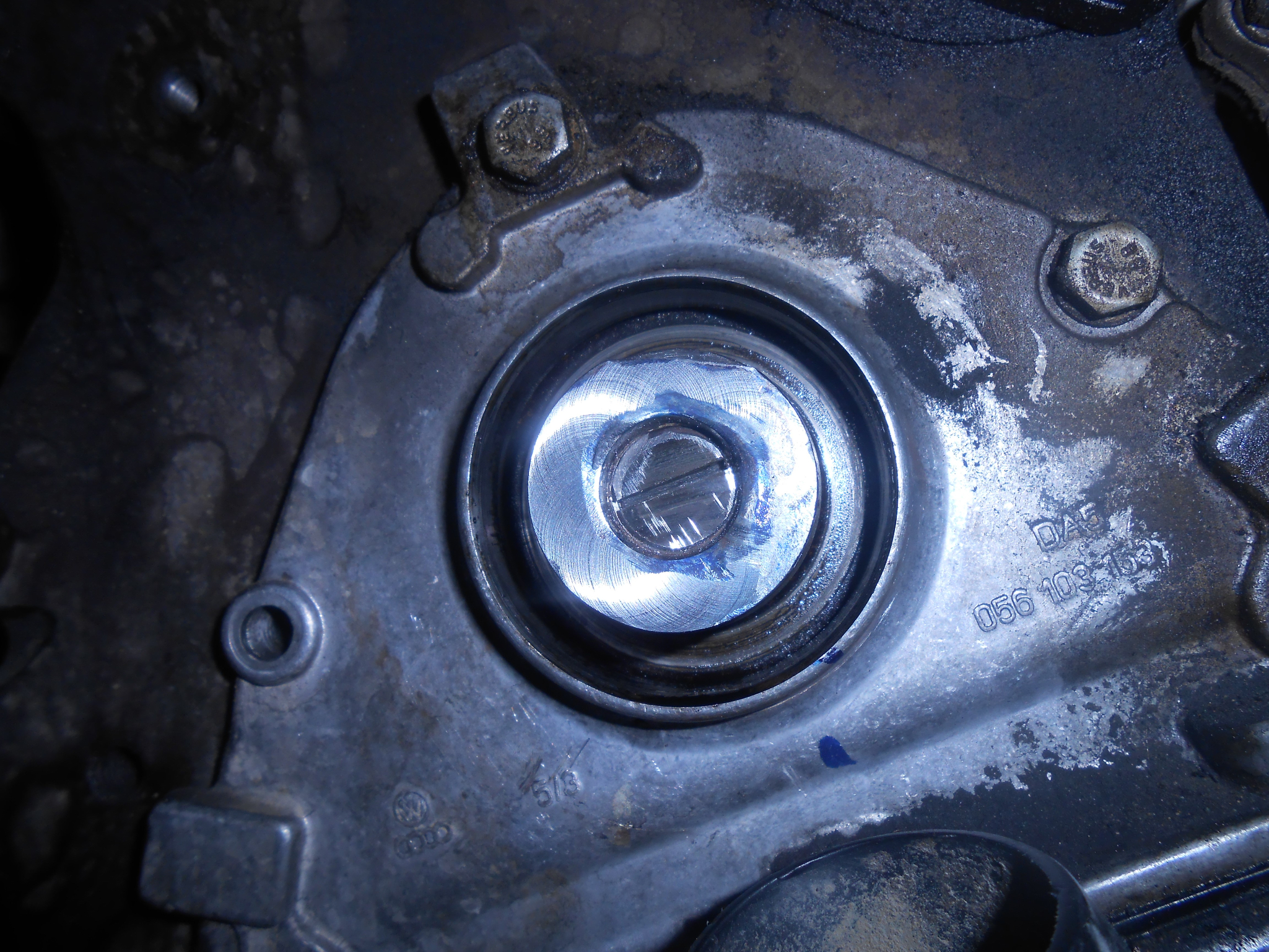 После ползвайки челен опит от братушките вадим семеринга на коляновия вал за да имаме достъп до шлайфаната повърхнина на вала зад него: