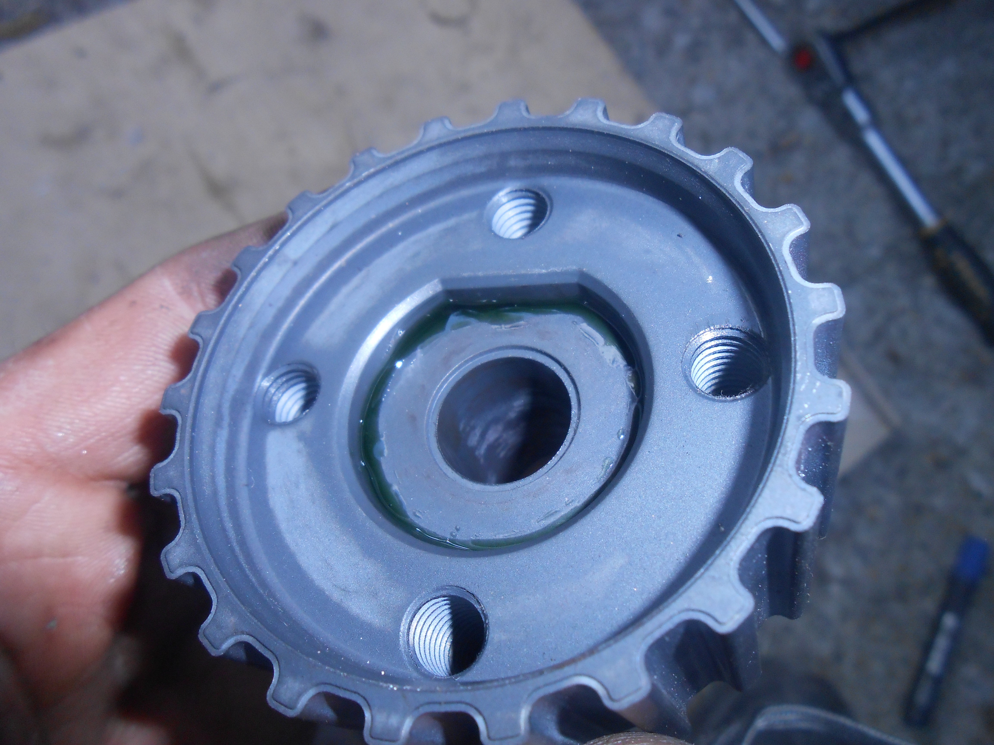 И започнаха безброй сухи тренировки за центроване на новото колело. Никак не е лесно, защото освен челото на вала, и диаметъра и засечката имат подбито от предишно разхлабване. В резултат колелото хлопа на вала. Със сухите тренировки успях да постигна биене от 0,03мм до 0,15мм. Хванах му долу горе чалъма как да го притискам при първоначално стягане за да е минимално биенето и пристъпих към лепенето на новото колело. Реших да го залепя с Loctite 638 точно заради това подбиване на засечката и диаметъра, за да може лепилото да уплътни тази фуга.
