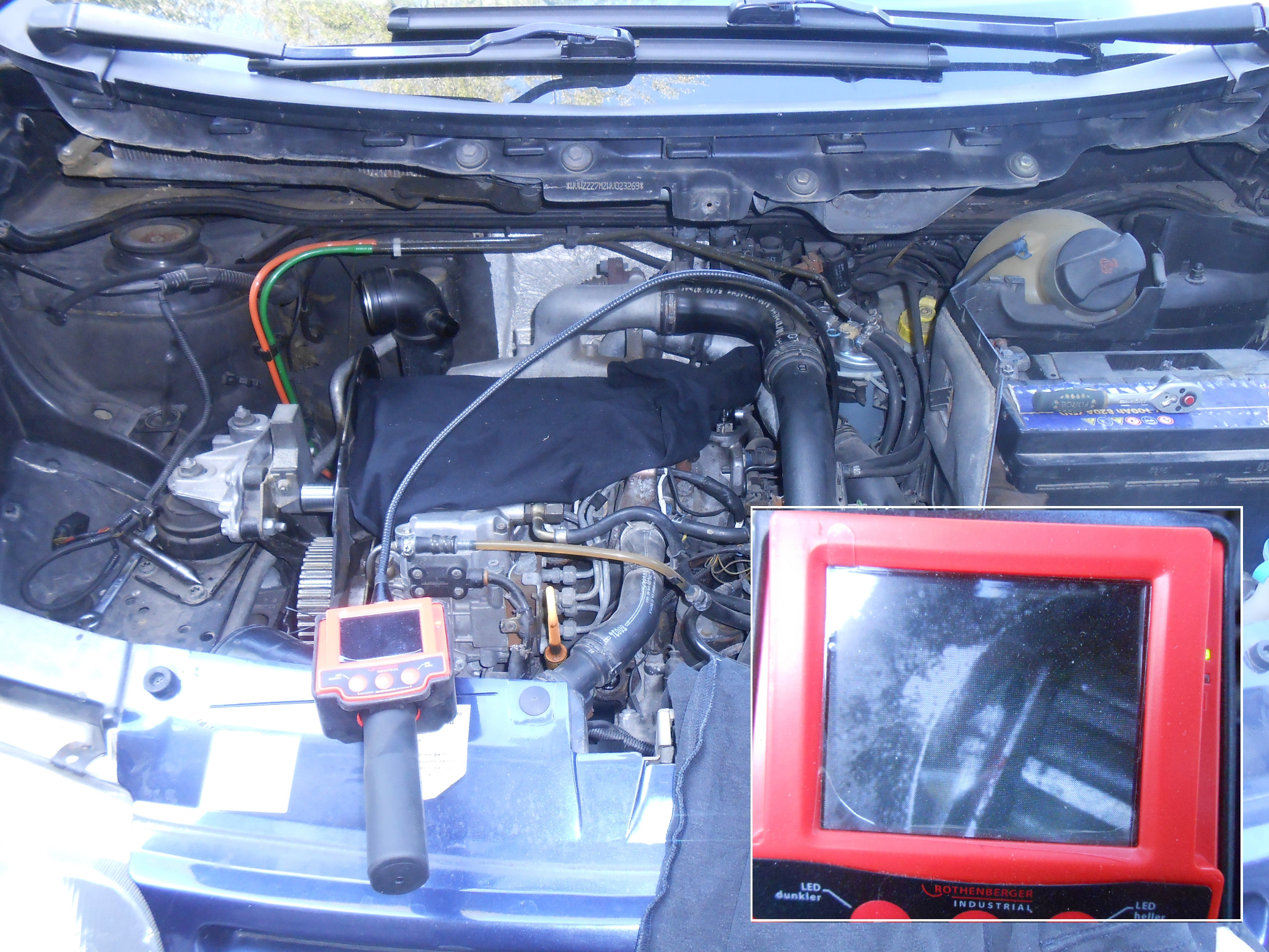 явно усилието за стягане на болта е помръднало леко колелото спрямо вала. Все пак е 5 пъти по-добре отколкото беше Да продължим с ремонта. Намираме белега за ГМТ на маховика. Аз ползвах ендоскоп за да не разглобявам и другата половина на автомобила
