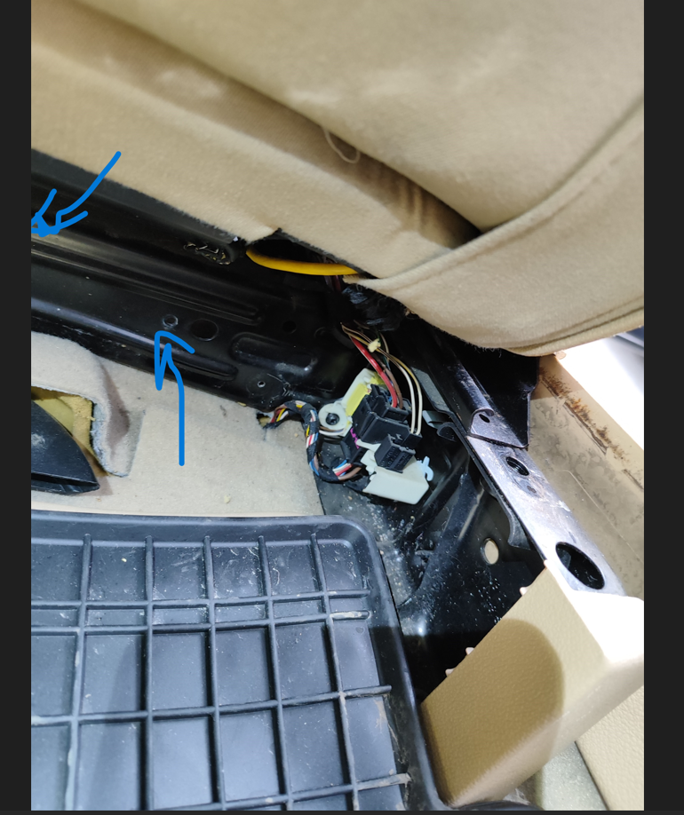 2. Маха се жабката под седалката. За целта трябва Т20 накрайник. Има 2 болта дитектно под седалката и два, които са достъпни като се влезне от задната дясна врата намиращи се на метален праг, над въздуховода за крака. Това е снимка на местоположението на болтовете отзад -> . Под седалката забравих да снимам...