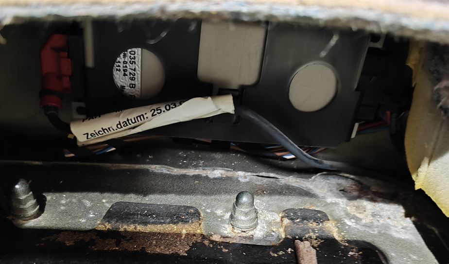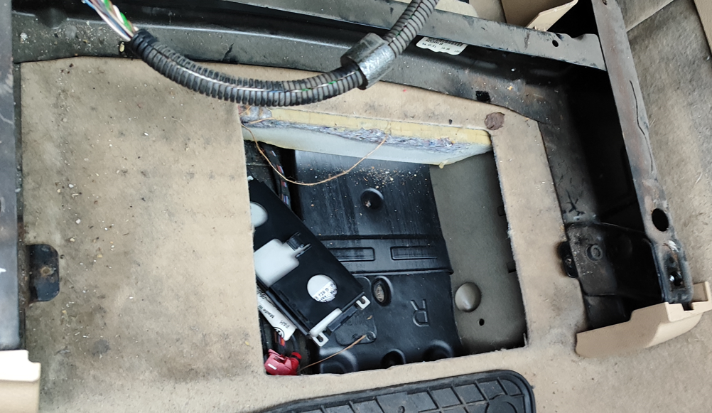 4. Блутут модула се намира в дясно на отвора, закрепен за дясната част на колата. Трябва да се бръкне с ръка тук -> . Погледнато в дупката това е локацията на модула -> . Той се издърпва с ръка и след това може да се разкачат буксите.