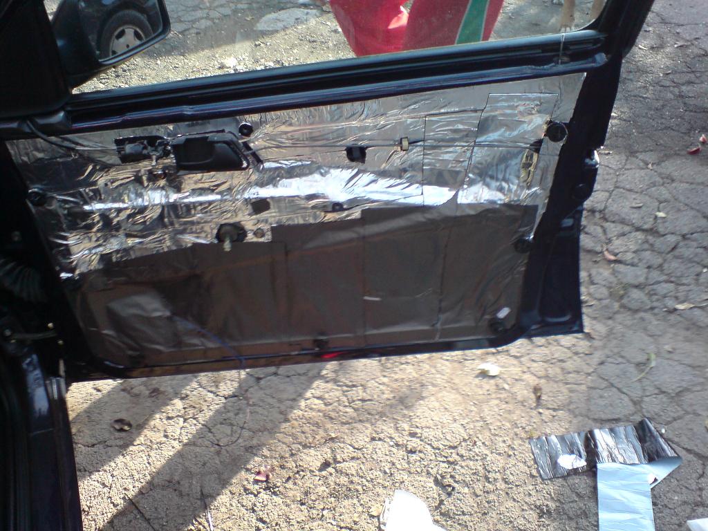 Ако е нещо различно от 4ома ще е шок :wink: А за да е ефекта максимален си изолирайте вратите. В практикер има една битумна изолация за покриви, която е идеална за целта. Всъщност са 2 модела с алуминиево и полимерно фолио и са по 20лв ролката. С една ролка от това с полимерното се обработват без проблем и 2-те врати. На снимката съм ползвал и от 2-те. По важно е да се облепи външната ламарина на вратата, а тая "завеса" дето я направих на снимката вече беше в повече.