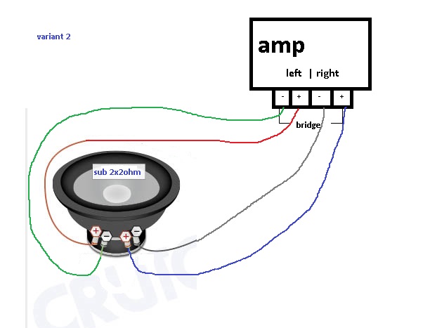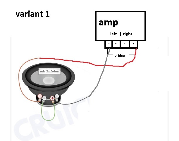 знам че усилвателя няма да може да да го захрани на 100 процента но ме интересува дали може да се свърже какъв ще е резултата и най вече как се свързва този 2х2 ома говорител всеки канал на усилвателя се свързва с една намотка нали или греша ? тоест усилвателя е двуканален и взимам единия + и - и ги свързвам с + и - едната намотка а другия + и - с другата намотка така правилно ли е ?благодарая предварително всяка информация би ми била полезна :)според вас кой от двата варианта на свързване по долу е правилния в моя случей