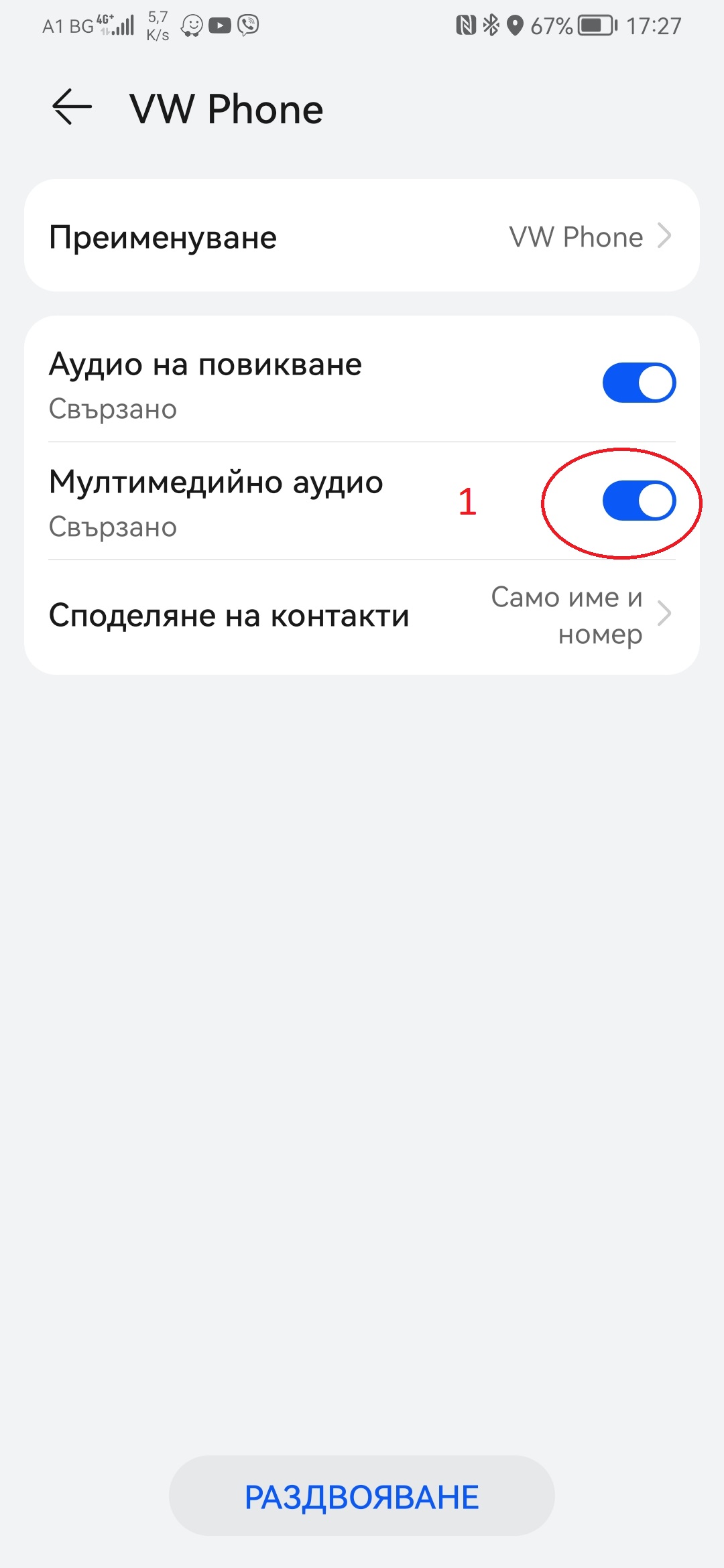 От настройките за сдеоени устройства на телефона задай медията да възпроизвежда само звука на разговорите.