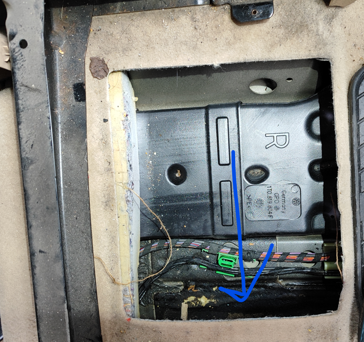 4. Блутут модула се намира в дясно на отвора, закрепен за дясната част на колата. Трябва да се бръкне с ръка тук -> . Погледнато в дупката това е локацията на модула -> . Той се издърпва с ръка и след това може да се разкачат буксите.