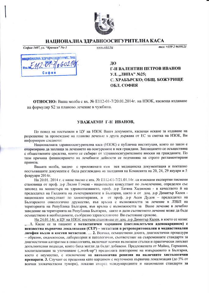 Ето ни отново.Срещата мина чудесно,обсъдихме ситуацията,оставихме материалите от двете операции за нови хистохимични изследвания.Вальо даде и много кръв за различни изследвания.Ще бъдат направени и тестове за каква химиотерапия ще бъде най-податлив и какво лечение ще бъде най-подходящо.Това в България не беше възможно да се случи.Резултатите ще бъдат готови началото на другата седмица и във вторник 14 часа сме отново при доктора.В зависимост от резултатите ще мислят и казват какво ще правим след това.Най-вероятно ще има нов PET-скенер,които да даде актуална информация за положението в момента.Направиха и бързи кръвни изследвания днес,резултатите са задоволителни предвид скорошната химиотерапия.Поставихме началото,сега изчакваме резултатите и действия....
