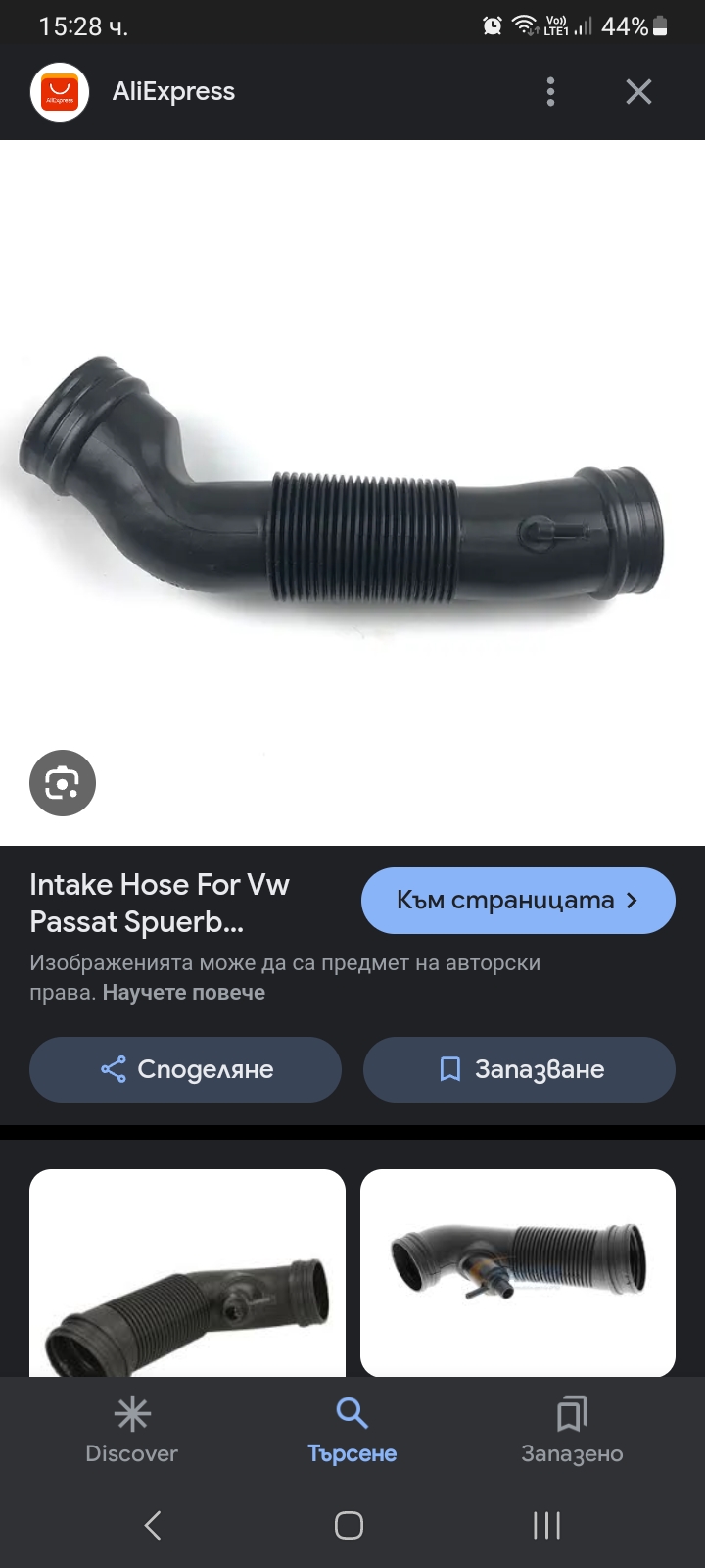 Здравейте колеги. Търся за пасат б5.5 1.6 бензин 102 коня, код на двигателя ALZ а не AHL, гофрираната тръба от кутията на въздушния филтър към смукателния колектор, номер на частта "06B 129 627 E". Тръбата трябва да има един малък Г-образен извод, за вакуум мисля че е, в началото на тръбата, веднага след дебитомера. Моля да предлагате това което търся, а не каквото ви падне и искате да го пробутате. Повтарям - гофрираната тръба от кутията на въздушния филтър към смукателния колектор,за пасат б5.5 1.6 бензин 102 коня, код на двигателя ALZ, тръбата трябва да има един малък Г-образен извод за вакуум веднага след дебитомера, тръбата я търся БЕЗ дебитомера. Номер на частта 06B 129 627 E, последната буква е Е а не коя да е друга. Прилагам снимка на същата тръба но за 2.0 бензин тъй като не мога да намеря никъде за 1.6, дори в магазина ми казват че частта е спряна от производство, затова и търся употребявана. На моята кола явно е имало някакъв проблем при предишния собственик, и е отрязана частта където е Г-образния извод, и на нея е нахлузена тръба която според парт номера е за голф 4 1.9 110 коня дизел, и е облепена с изолирбанд явно за да не пропуска въздух. Но имам съмнения че пропуска затова търся това което трябва да е. Пак моля предлагайте само това което търся, и моля без излишни коментари и разтягане на локуми, даване на акъл и тем подобни. Търся артикул и нищо друго. Благодаря предварително и лека вечер.