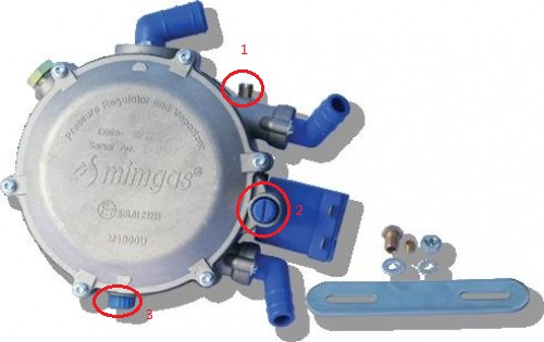 Зимно време даваш малко повече аванс на винт 1 и завинтваш винт 2, да не ти харчи много. Винт 1 ти е байпас, който ти осигурява постоянен проток на газ. Иначе в много студено време, ако ти е стар изпарителя, мембраните се спичат и стават бетон, та е добре с малко вряла водичка преди това да го поолееш. да ги поразмекнеш и ще си палиш на -20 на четвърт оборот!