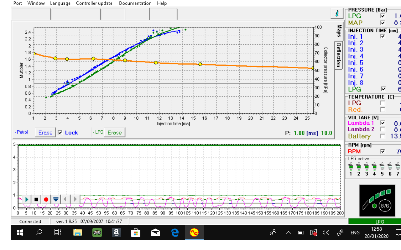 Обаче тук има проблем. Започва да пали по-трудно на бензин. Опитно установих, че когато я настроя на начален коефициент 1.5 пали веднага на бензин и разиграва оборотите много рядко. Добре е, ама тогава пък инжекторното време на газ е 3,2 м/с, а на бензин 3,6-3,7 м/с, което се усеща при преминаване от гориво на гориво.