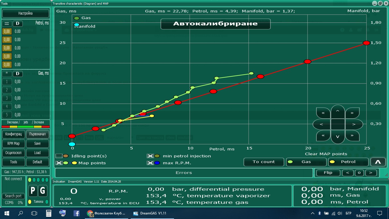 След това в движение на бензин събирам точки като се старая да мина през всички режими на двигателя - от вискои обороти и ниско натоварване до високо натоварване и ниски обороти. След това събирам точки при движение на газ и се старая така да променя газовата графика, че да съвпадне възможно най-много с бензиновата. Пример на снимката - подчертавам че тази снимка не е актуална