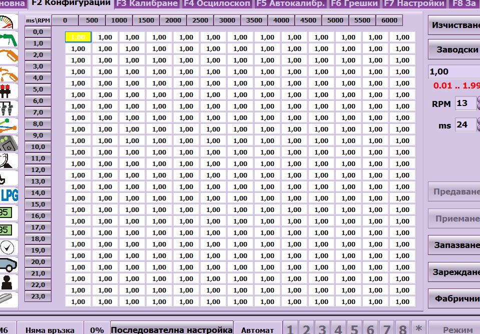 Прост пример, караш с 90км на бензин и гледаш къде е точката в таблицата ( при запален автомобил трябва да играе точка с оборотите и натоварването по тази таблица) Гледаш къде е точно точката в таблицата и какво е бензиновото време, шофьора задържа педала на гаста в същото положение ,че точката да не мърда от там и обръщаш на гас и пак гледаш бензиновото време. Ако бензиновото време на гас е по-голямо от това на бензин трябва да увеличиш коефицента в съответното поле и обратното ако бензиновото време на гас е по-малко от това на бензин трябва да намалиш коефицента. Дано си ме разбрал.. Аз поне така правя настройките и съм доволен от вървежа и разхода.