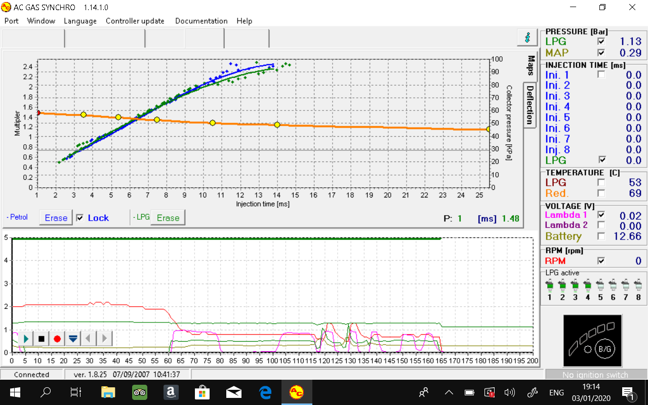 Сега открих как съм си решил проблема. Променяйки ръчно налягането при калибриране, газовия контролер преизчислява коефициентите на инжекторите. Т.е. увеличавайки това налягане съм обогатил газовата смес. Последното е доказано емпирично, с четене на ламбда сондата. При работа на газ на празен ход, твърдо стои на 0,94-0,96В. При обръщане на бензин твърдо 0,06 В. Плюс това, колата започна да набира по-пъргаво.