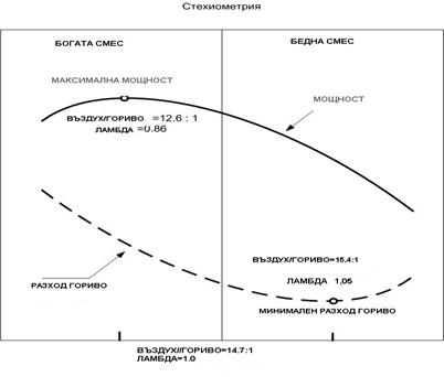 С прекалено богата смес мощността намалява също, както и с обеднената.