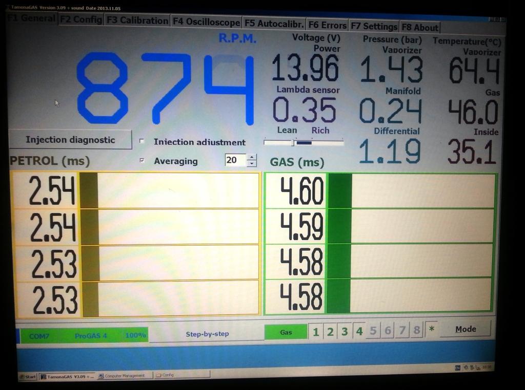 С какъв размер дюзи си? Каква е рейката? С какъв изпарител си? Чипнат ли е двигателя?Направи скриин шот при работа на газ и на бензин(по отделно,разбира се)!