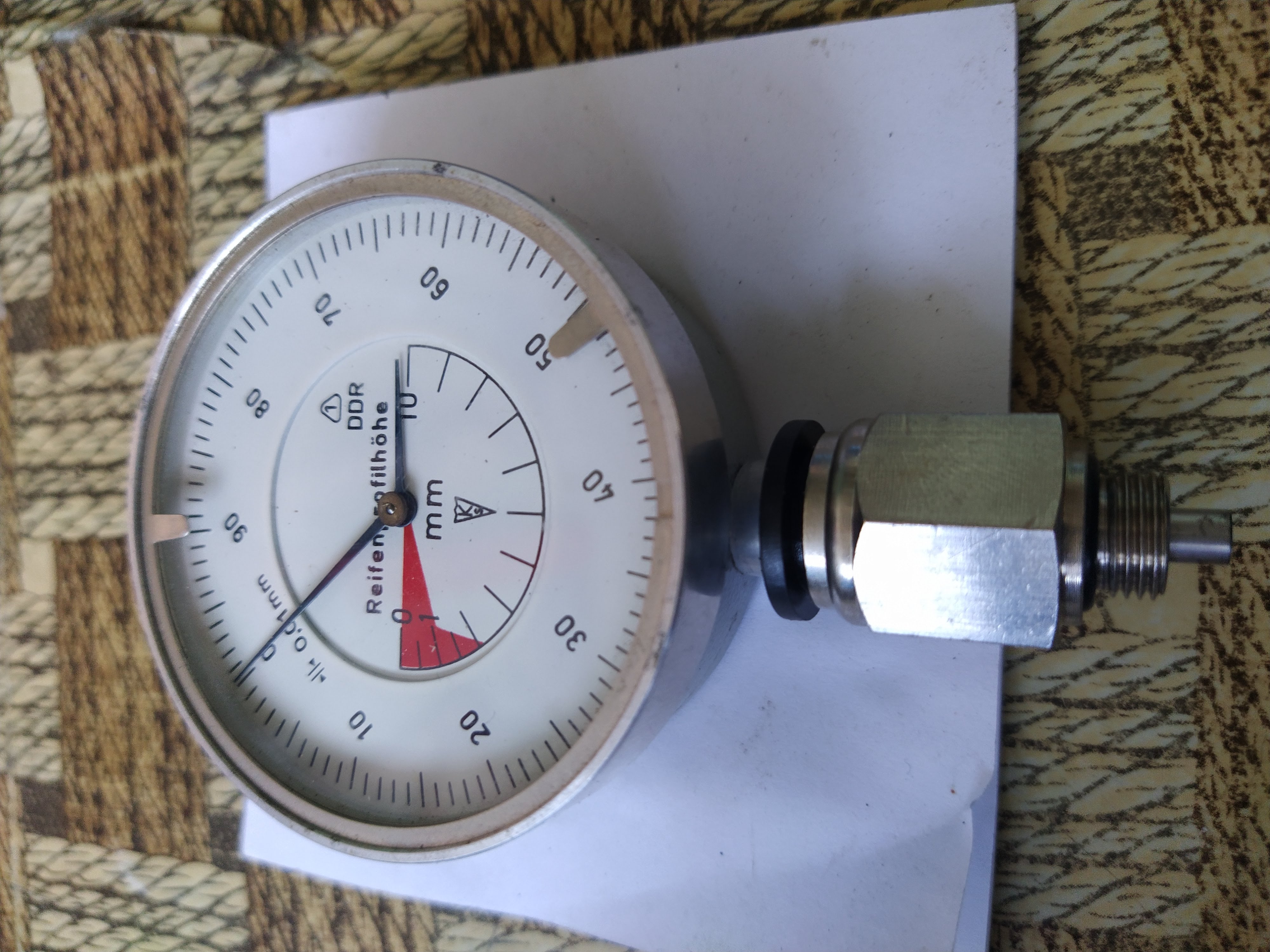 Китайският дълбокомер не ползва резба. Опира в корпуса на рейката и лоста му потъва, докато опре на буталото вътре. Тогава се занулява уреда. При пускане ток на дюзата . тя го избутва и отчита реалното отклонение от нула, затова и не съм обръщал внимание на резбата досега. Можеш да използваш една дюза и от нея да си направиш преход, мисля че са със същите резби като на новите модели.
