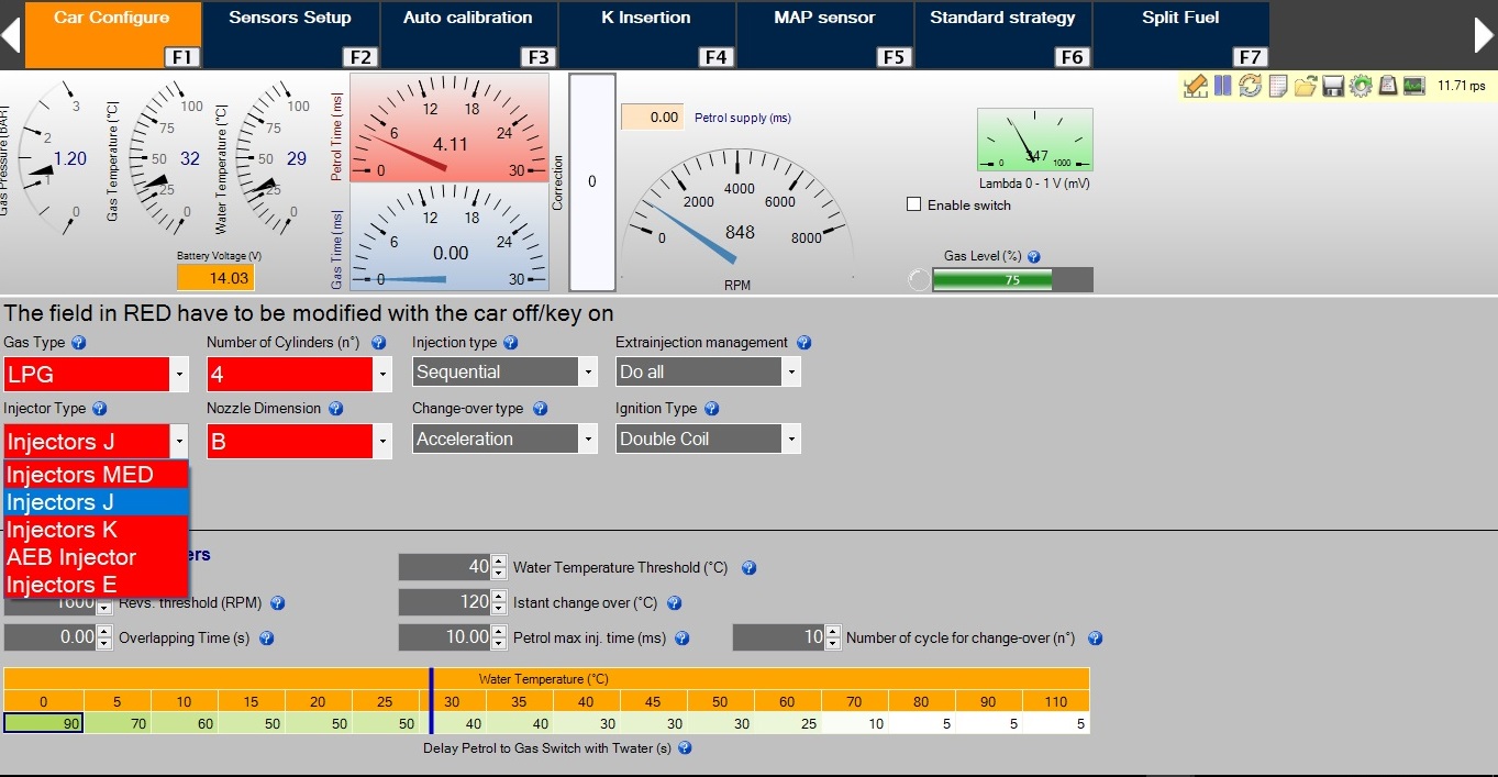 Важната част, специално при настройката на Landi Renzo е след смяната на всичко, да се пусне задължително първо опцията Автокалибриране, чрез което газовия компютър да направи първоначалната таблица. След това вече върху нея се започват ръчните корекции, а не да се правят корекции на готовата таблица с която е работила газовата, докато е била с оригиналните инжектори Landi.