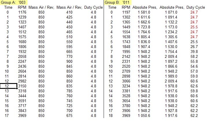 Вижда се, че Duty cicle на група 11 (което би трябвало да бъде движението на Н75) отваря чак при 1700 оборота.