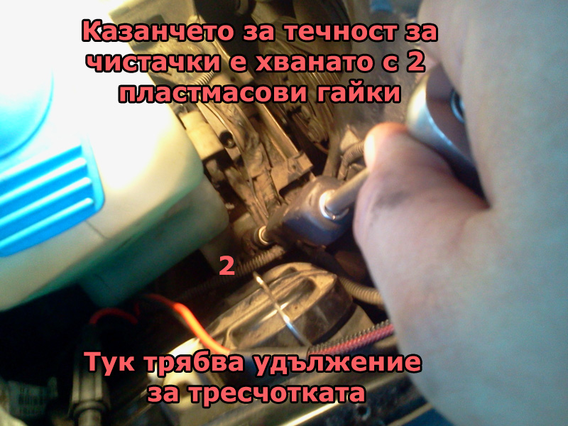 Започваме свалянето на казанчето за течност за чистачки. То се държи на 2 пластмасови гайки 10 мм. След като ги развием, трябва да му се откачи една букса, както и да се изтръгне нагоре помпичката за водата. Като се извади помпичката през дупката започва да тече течност за чистачки - бъдете готови да я запушите с пръст и да имате подходящ съд да я прелеете.