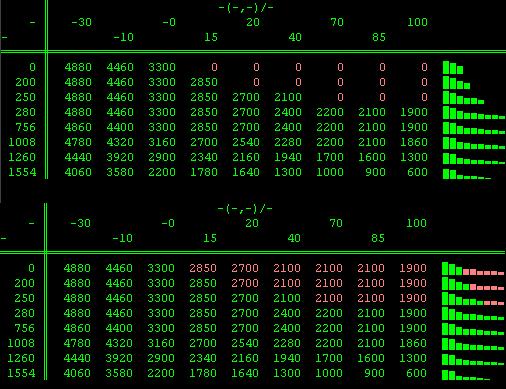 Щото има такива неща заложени в заводския софтуер. Не на всички разбира се :) . До колкото помня е често срещано по тия с роторната помпа (1.9 TDI 90/110кс) в софтуера за ръчни скорости (при кодиране за автоматични скорости се ползват други таблици и там проблема го няма). Ето един пример от някакво такова 1.9 TDI. Горе е оригиналната таблица за подаване на гориво при палене, долу е корегираната. По Х е температурата на антифриза, по У са оборотите на мотора. Стойностите в таблицата задават милиграмите впръскано гориво.
