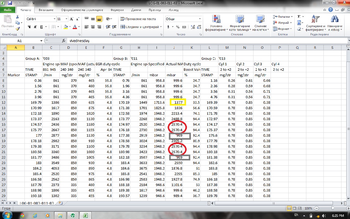 Да раздвижа малко старата тема с два лога правени един след друг, ако може да ми ги разясните, щото колата ми забива. Какво значат тези стойности и какви трябва да са нормалните. Колата ми е 1.9 АФН без чипове, чистена геометрия преди 300 км, затапен на 100% ЕГР, и продължава да прави мизерии, какъв може да ми е проблема? Благодаря.
