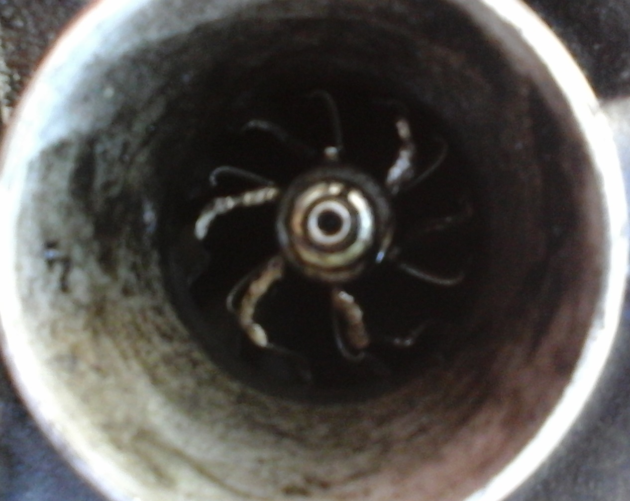 Колеги , взех турбото и качвам една снимчица за да видите пораженията. Надявам се да се вижда де. И да отбележа , че луфта на оста е около 0.5 см