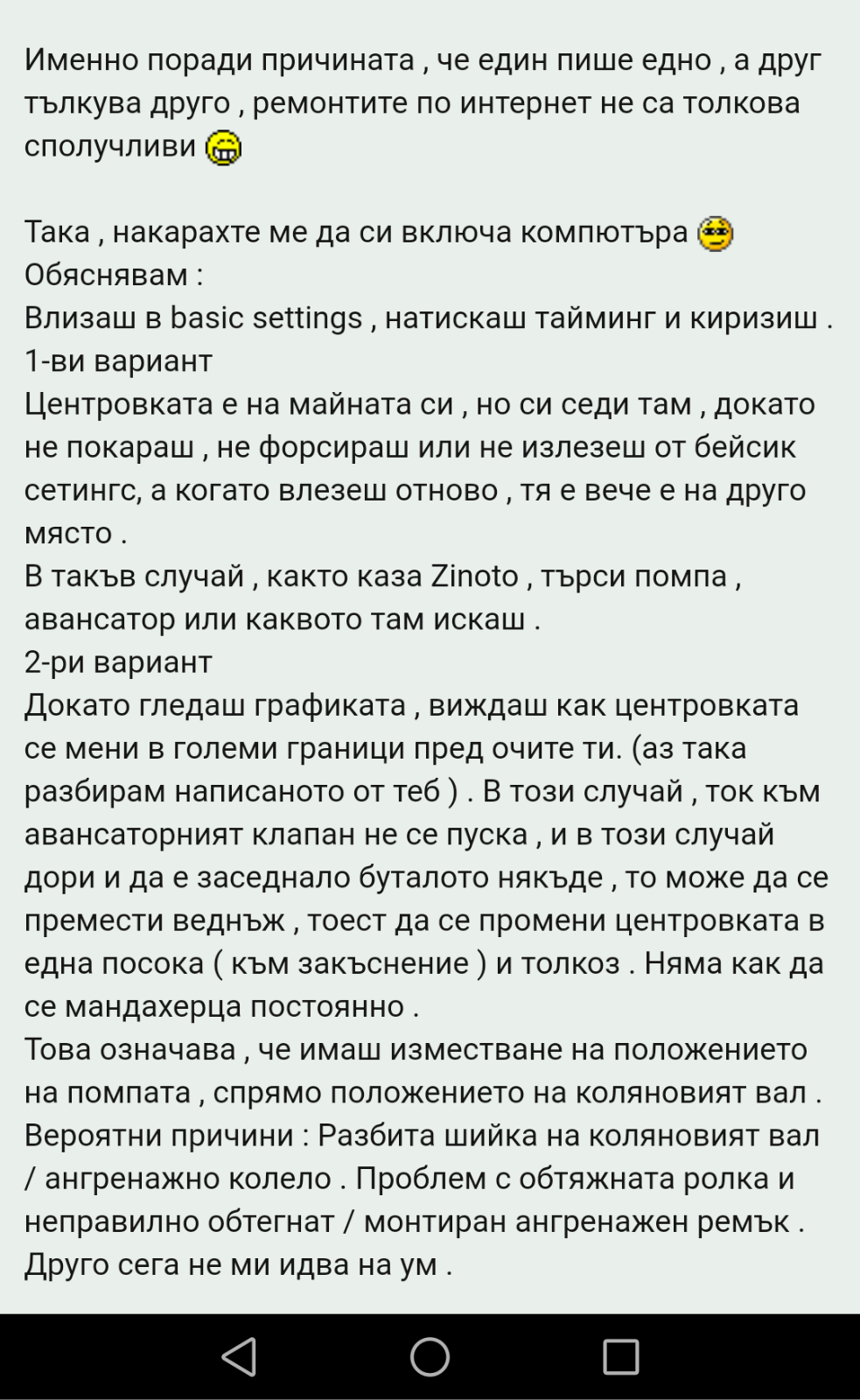 Просто незнам каде може да е проблема,мислех авансаторен клапан но при теста се осеща промяна на работата на мотора,и процентите се движат,първият ден колкото и да се мъчех да изтрия грешката не стана, снощи можеби след 2-3теста на авансатора грешката се изтри каква е причинта нз.