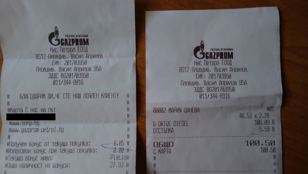 Нещо не им разбирам как се формира бонус отстъпката на Газпром. Според страницата им, заредени литри * стойността на отстъпката (според плана и вид гориво). В моя случай 46.53 * 0.10 = 4.65, а на бележката друго пише. Иначе тия 5.59 са ясни от "-12 стотинки" Не че им се дърпам, просто ми е странно