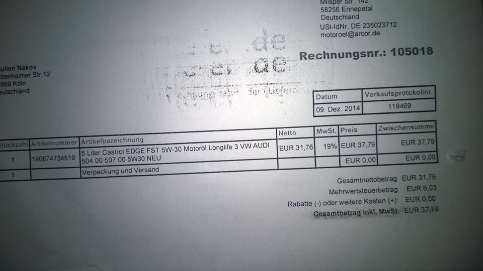 И аз вчера сложих същия Кастрол,но го взех 5л. за 60 евро.Живея в Германия.От къде го взе толкова евтино колега?За същото масло във ФВ ми искат 32 евро за 1 литър :) и значи 5 литра струват към 160 евро.
