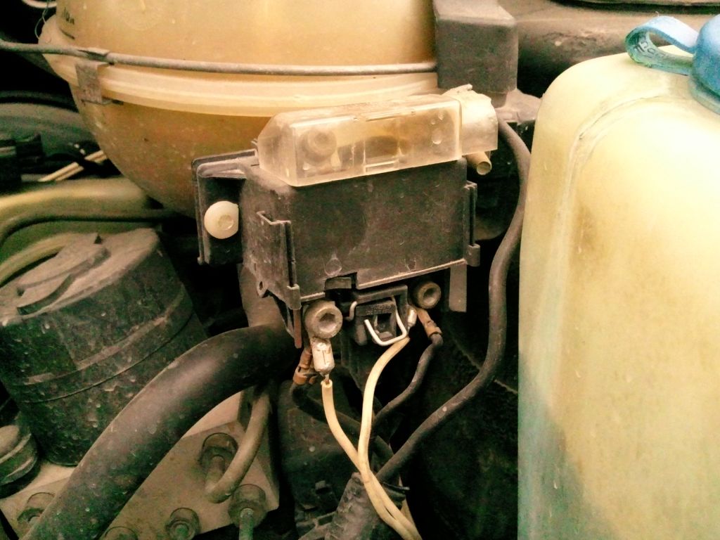 това е релето и отдолу се виждат двата бели кабела със кабелни обувки като левия е за двете свещи а десния за едната.