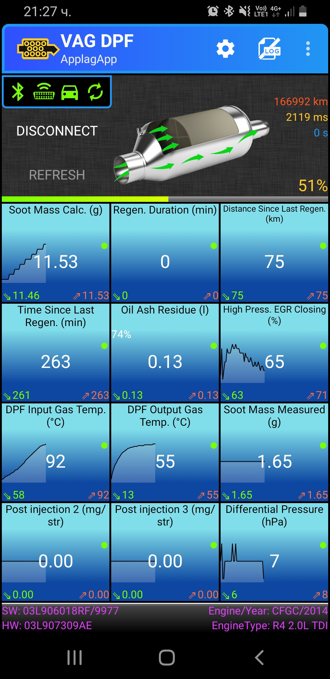 Регенерацията се извършва по алгоритъм, в който участват много фактори. Може за тези 600км да са се случили две регенерации, може да не е станала и нито една. Зависи с какъв софтуер е автомобила. Общо взето няма значение колко дълго си пътувал, стигне ли 24 грама сажди регенерацията започва, като това са изчислени сажди (calculated), не са реално измерени (measured). Най-неприятно е да се върна от 400км пътуване и регенерацията да започне при паркиране до блока... Но това е положението. Елм327 си взех от али експрес , но внимавай че има такива , които работят само на бензинови двигатели, уточни го преди да купиш откъдето и да било. При мен градско прави регенерация на всеки 150-200км извънградско 350-400км , стартира при 24 грама сажди или 400 минути и спира при 5.9грама общия случай. При предишната версия на софтуера интервалите са доста по-големи.