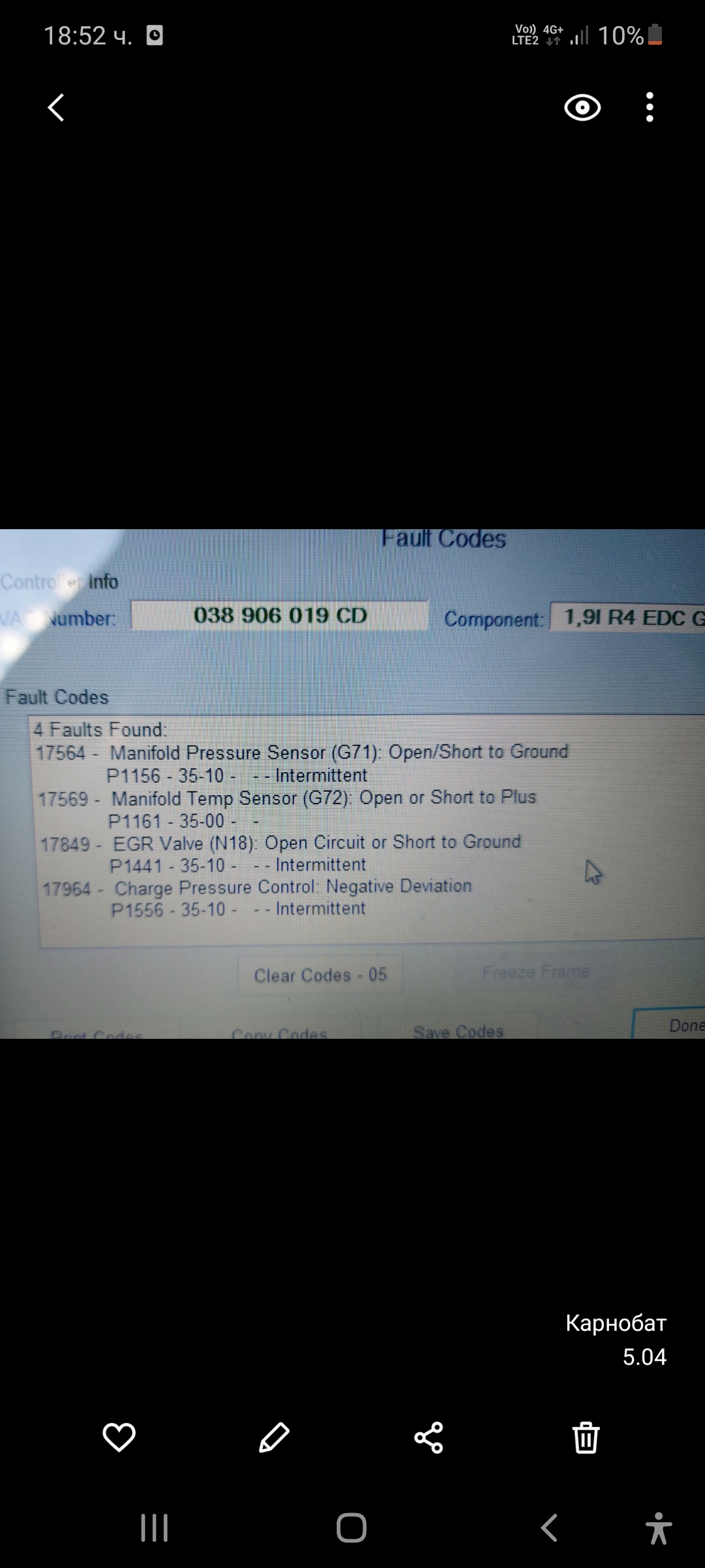 Колеги. Все си го има късното включване на турбото. Актуатора е малко пипнах, но ми заби грешка и в егр n18 грешката за темп сензор я знам. Но др дайте малко помощ n75 или n18 ми е за смяна. Ето и снимка