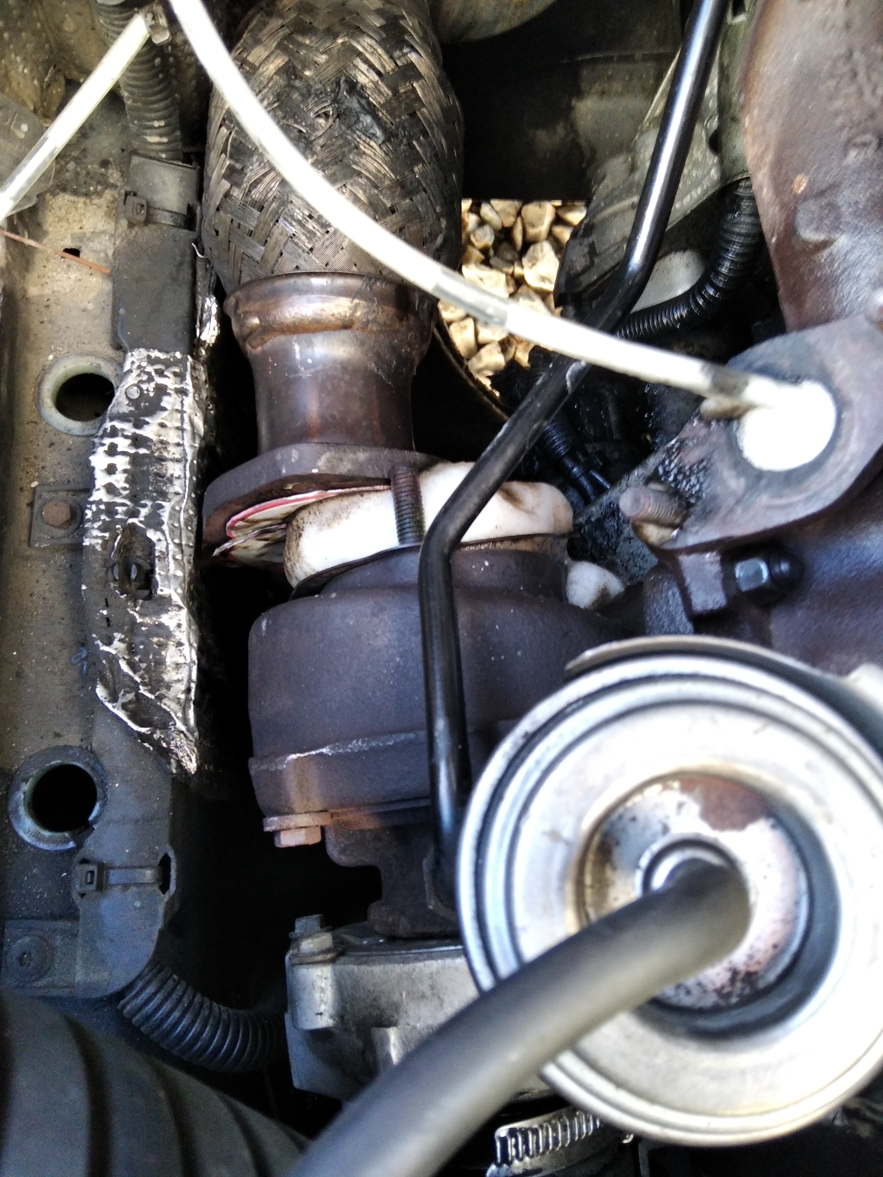 Здравейте колеги, днес направих въпросното почистване на геометрията на Аудито ми а 4 Б6 АВФ 130кс с наличен катализатор.За да си открия място махнах филтърната кутия после ЕГР тръбичка за да стигна до трите гайки на меката връзка.Там видях малко зор с вътрешната гайка (имаше минимален ход) после сложих две капачки от буркани за да не отиде цялата смрад при първото палене в катализатора.Почистих геометрията както си знам с помагайки с мой вакуум да раздвижа актуатора и всичко се получи чудесно.За да затапя пътя към катализатора сложих капачка от буркан подпряна на шпилките на турбото за да не влезе мизерията при паленето към катализатора.