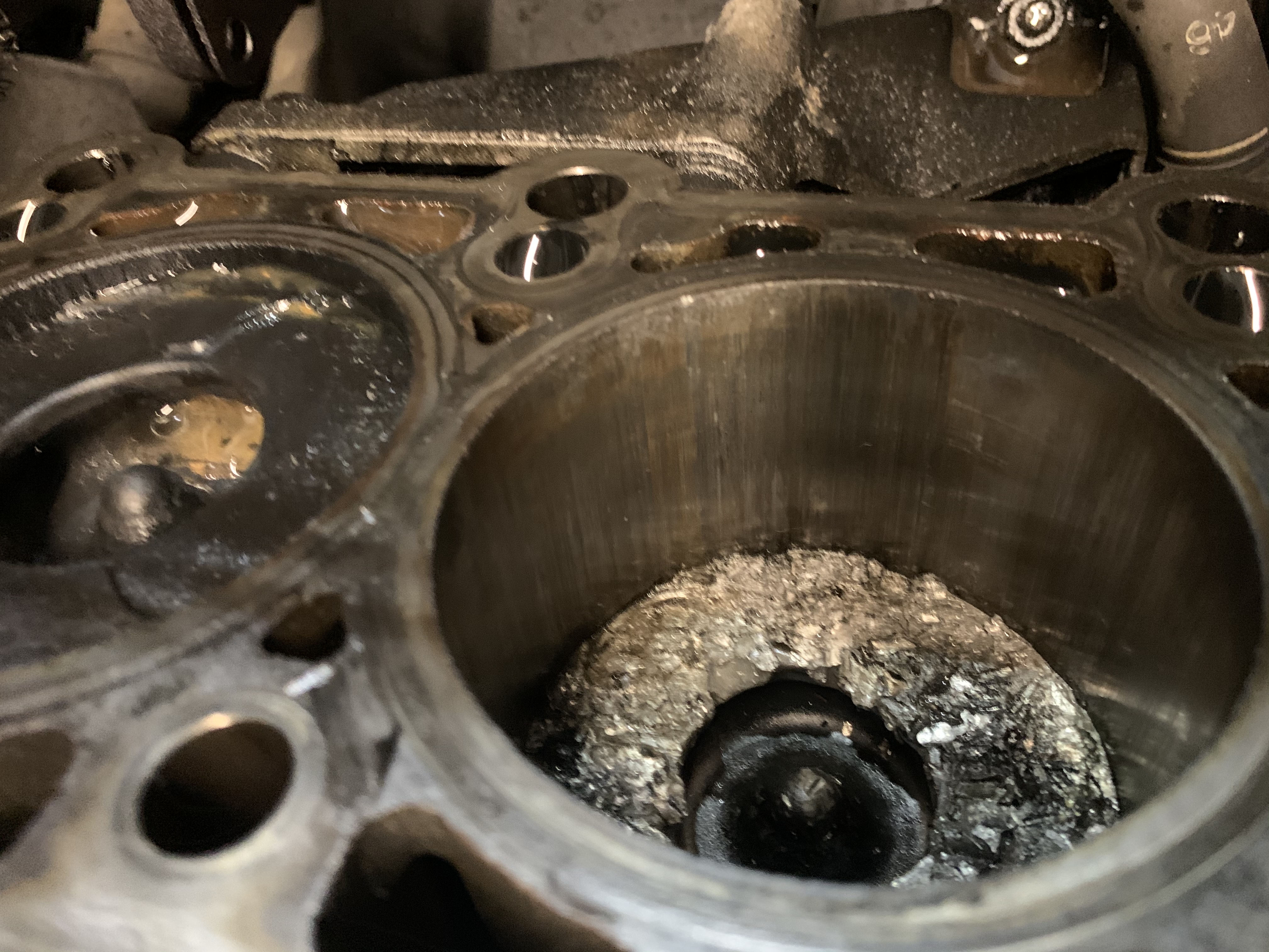 Това не се получава от тормоз, а дюзата пръска по някаква причина извън купата, това е типичен пример за неизправен инжектор. Стапяне на буталото от голяма продължителност след зъл чип тунинг не изглежда така. Същия цирк съм го виждал на редови 2,5 тди 5 цилиндъра и на прехваления 2,0д на бмв
