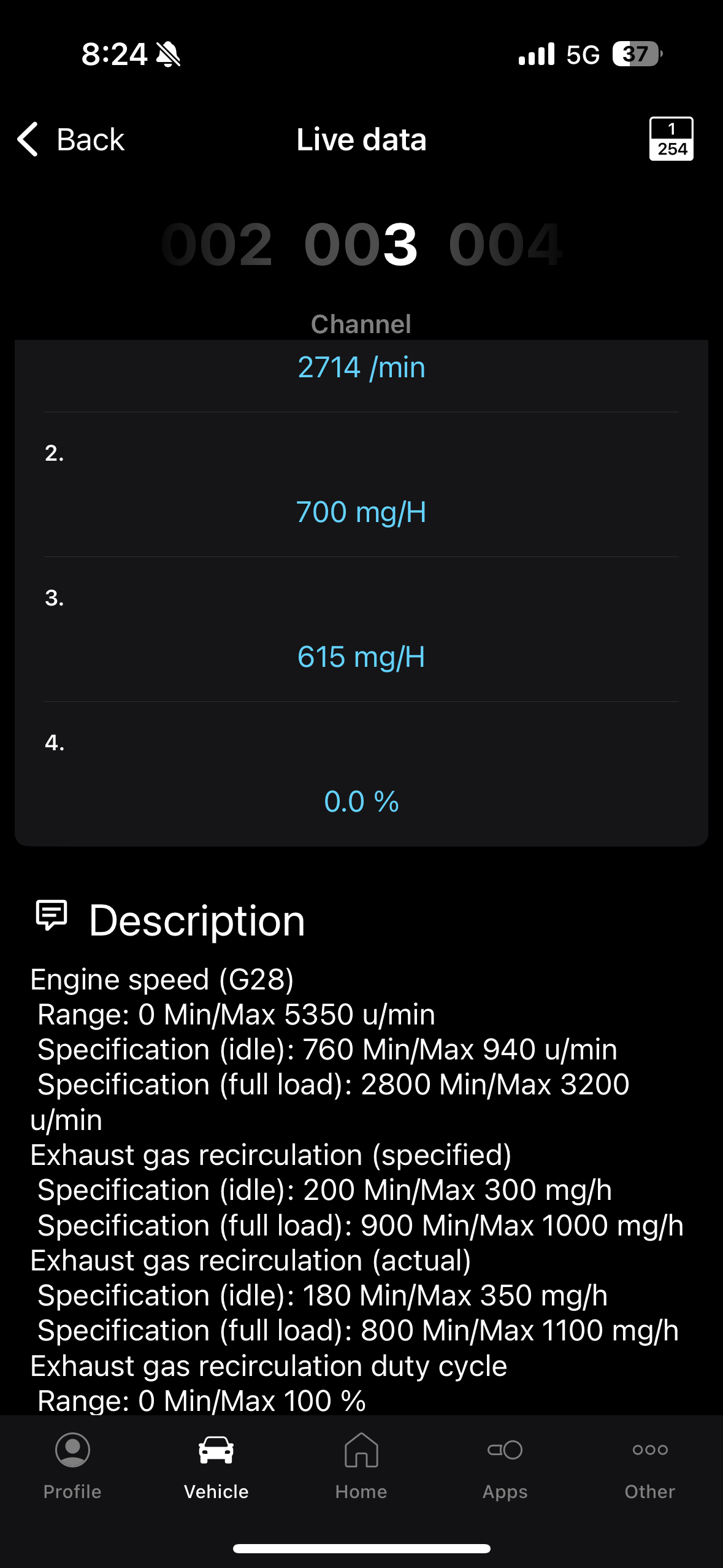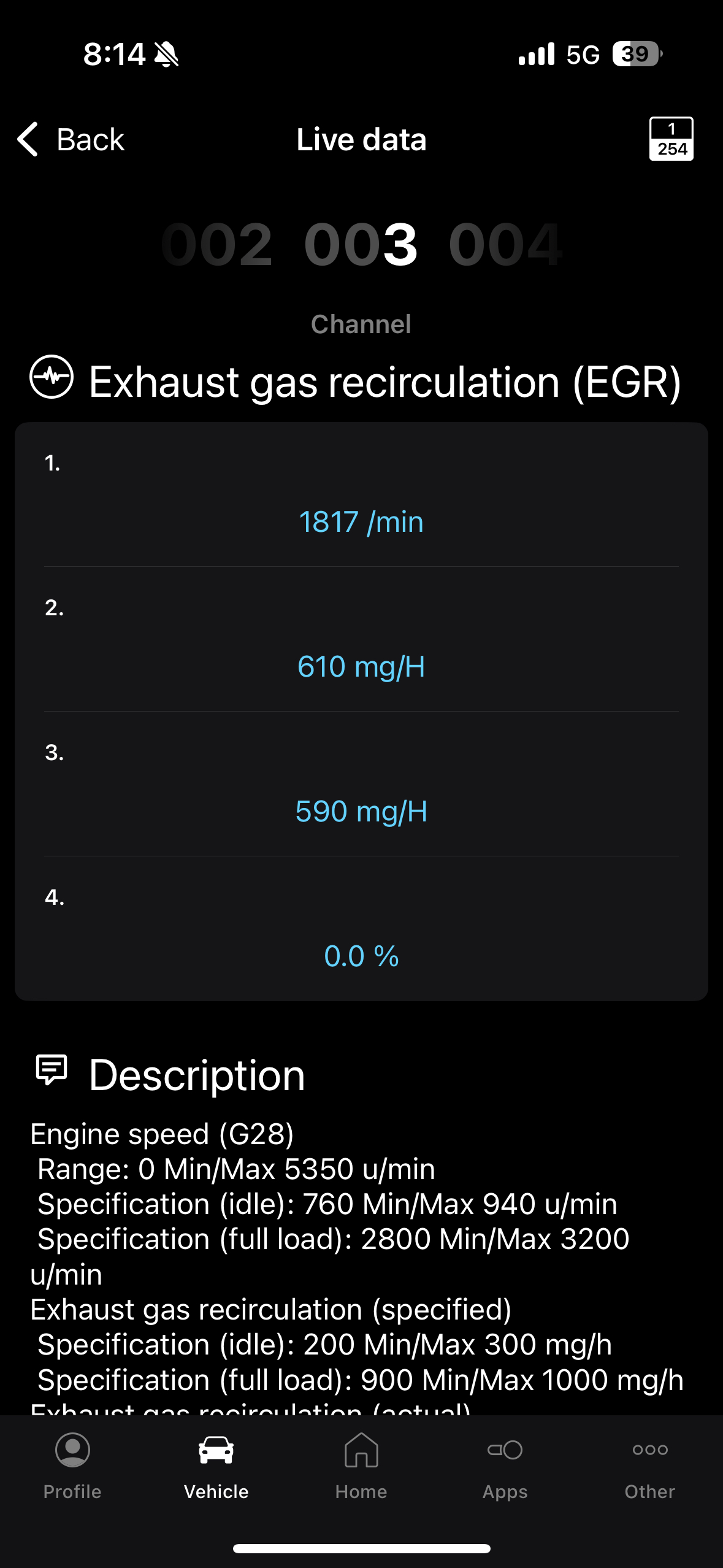 Първата е на загрял мотор, на трета предавка с цялата газ, виждате оборотите - 2714, второто е искано от ЕГР, третото е даваното реално, разликата е 85 единици - тоест, тук газовете недостигат.