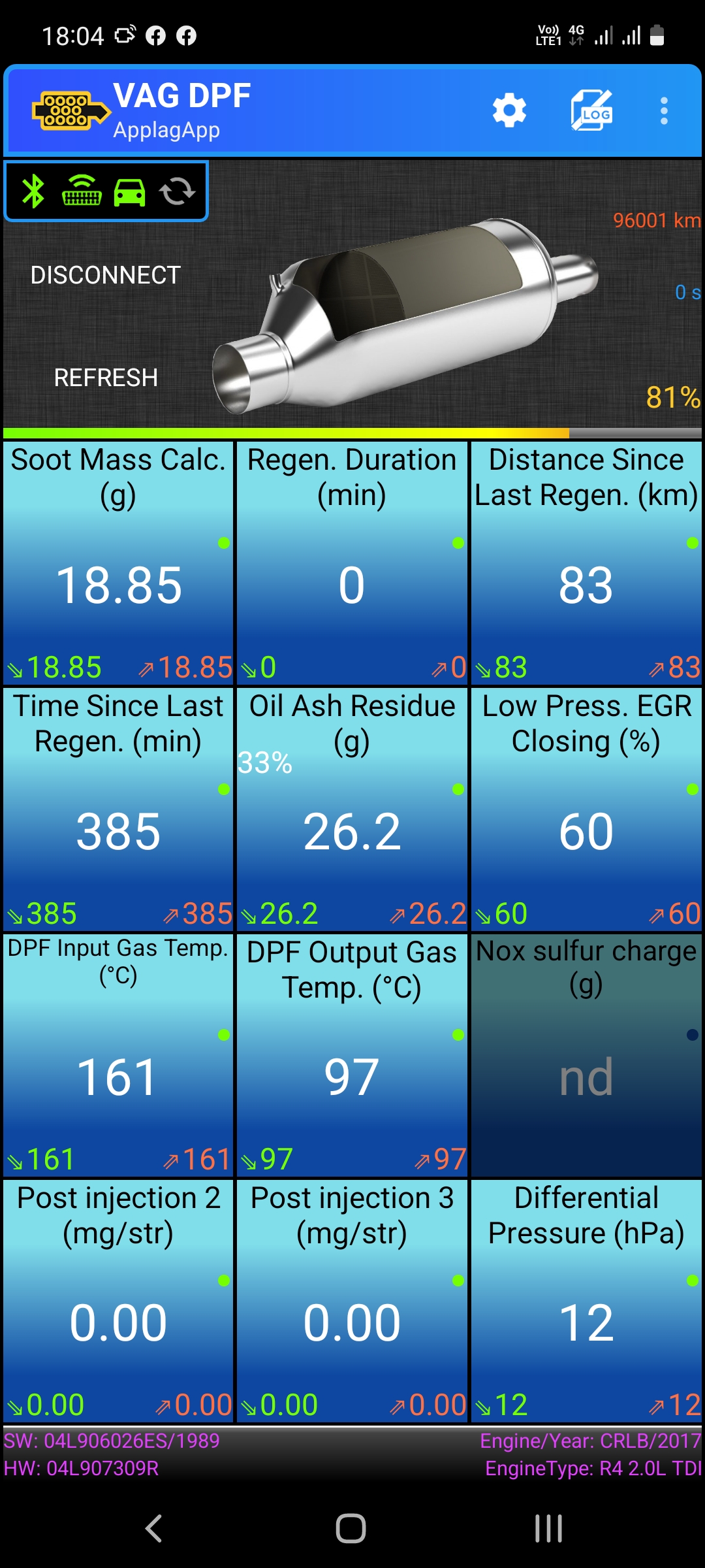Колата е на 95 хил.км. купувана и карана само в БГ, втори собственик съм. Иначе си поръчах от емаг третия четец, който препоръчват в описанието на VAG DPF в GooglePlay.