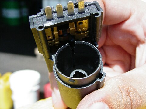 Ами мойте несветеха и мигаше лампата за свещите.Ето какво последва сваляте машинката,С малка отвертка натиснете палчето за да се освободи конектора както е показано тук. Издърпайте буксата и контактите от мястото им и плъзнете капачето с вашата отвертка. Пластината от дясната страна която контактува е окислена. И поради тази причина не може да се получи добър контакт. И ето защо ECU-то ви не отчита грешка, а в същото време стоп светлините не светят.Внимателно почистете пластината и от двете страни. Пластината трябва да стане чиста и лъскава. Трябва да внимавате да не отдалечите пластините една от друга. Ако сте направили това, ще е нужно да я върнете в изходна позиция, но трябва да го направите много деликатно за да не се строши.Сглобявате по обратния ред,но внимаваъте за това положение иначе ще трябва да я въртите.