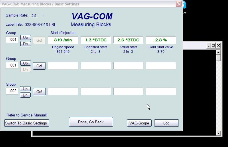 If you don't have the factory service manual, select "Measuring Blocks", and go to group 4. Do NOT use "basic settings" for this method. The displays show the requested injection timing, the actual measured injection timing, and the duty cycle of the advance solenoid. At warm idle in neutral, requested timing should be between 0.4 and 2.0 degrees BTDC. If the actual timing is not more than roughly 3.0 degrees BTDC, and the duty cycle of the advance solenoid is not more than 10%, the timing is good ... don't do anything further. If actual timing is more than 3.0 degrees BTDC, you need to make a mechanical "retard" adjustment. If the duty cycle is more than 10%, you need to make a mechanical "advance" adjustment.