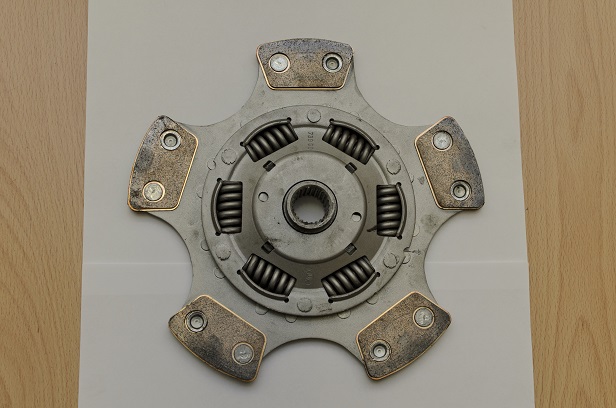 После: Свалям скоростна кутия и решавам да си накова керамични плочки на оригиналния износен съединител за да държи повече коне. Речено сторено в допълнения слагам и чисто нов притискател, понеже стария беше брутално износен. Дефакто -> поставям керамичния съединител от снимката + нов притискател.