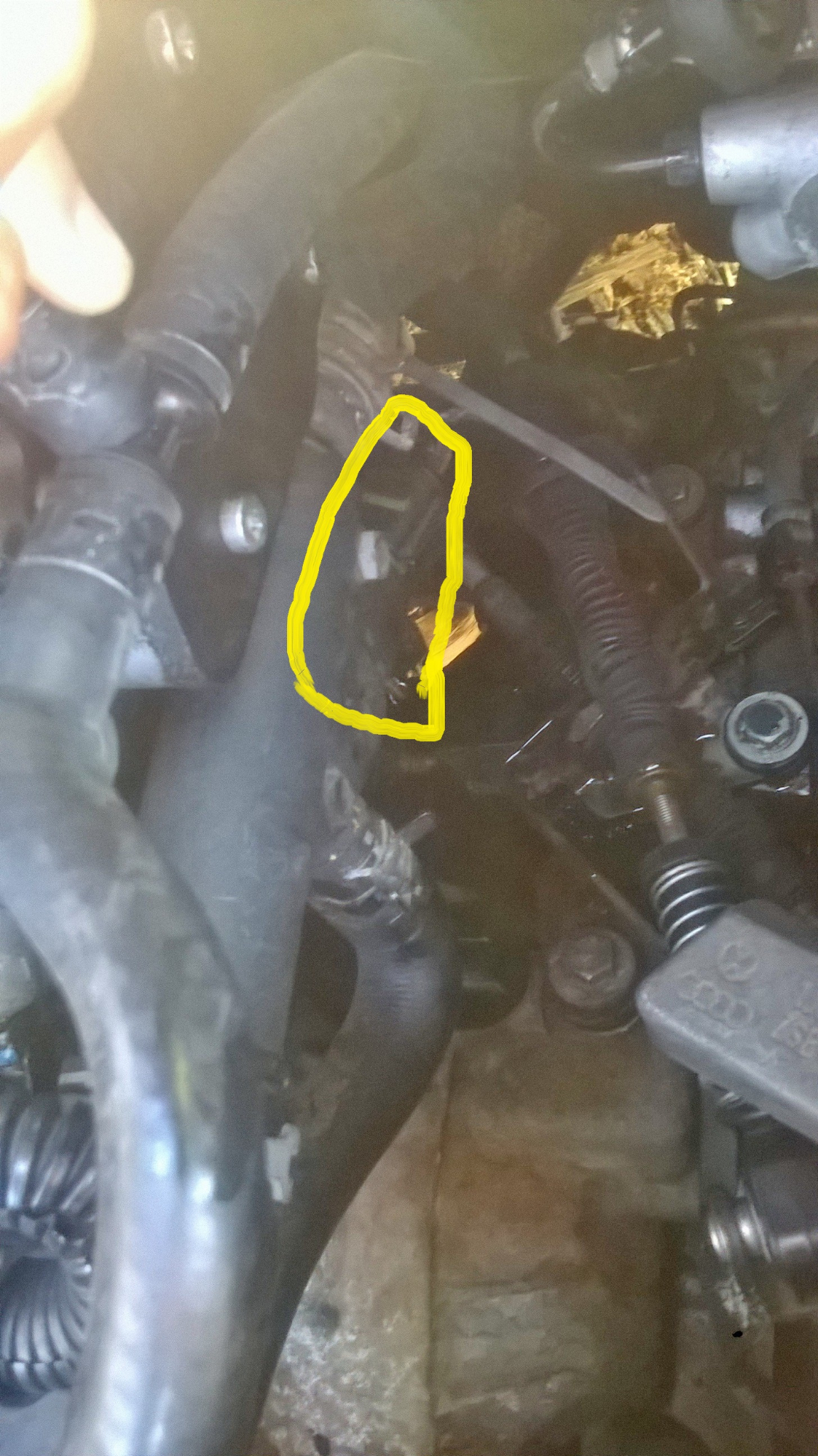 Да ме поправят колегите, но мисля че там се намира температурният датчик. Ако е правен опит да бъде ваден, заменен или просто да се откачи буксата му, вероятно след това не е бил закрепен. Опитай се да хванеш буксата отзад и да побутнеш в посока напред към радиатора. Аз имах подобен теч след един мой опит да стартирам зимата с извадена букса на въпросният датчик (просто не бях я закрепил).