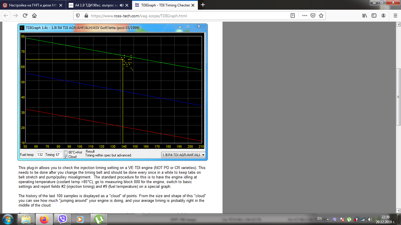 Колега това с тайминга е много относително. Ако темп. на горивото е по-висока таймингът ще е по-малко от 50 и пак ще е на синята линия. Много колеги съветват центровката да отговаря на исканото на компа което е много добър вариант, но на тези двигатели аз винаги съм правил центровката да е около 2 градуса и авансатора 2,8% и колата пали и работи перфектно. Освен това с такава центровка на 1Z без катализатор и затапен ЕГР на прегледа казват, че вредните емисий са доста под нормата.