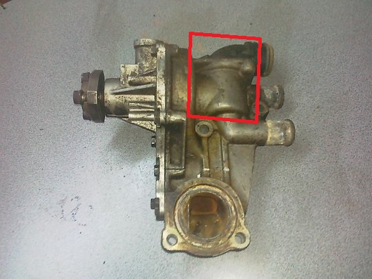 Не. Тази дупка под това ограденето със червеното ти е термостата.Само,че като гледам или е паднал или е останал горе във блока самия термостат :) Както каза колегата .. хидравличната помпа също трябва да се смъкне защото не може да се смъкне самата водна помпа .. просто пречи